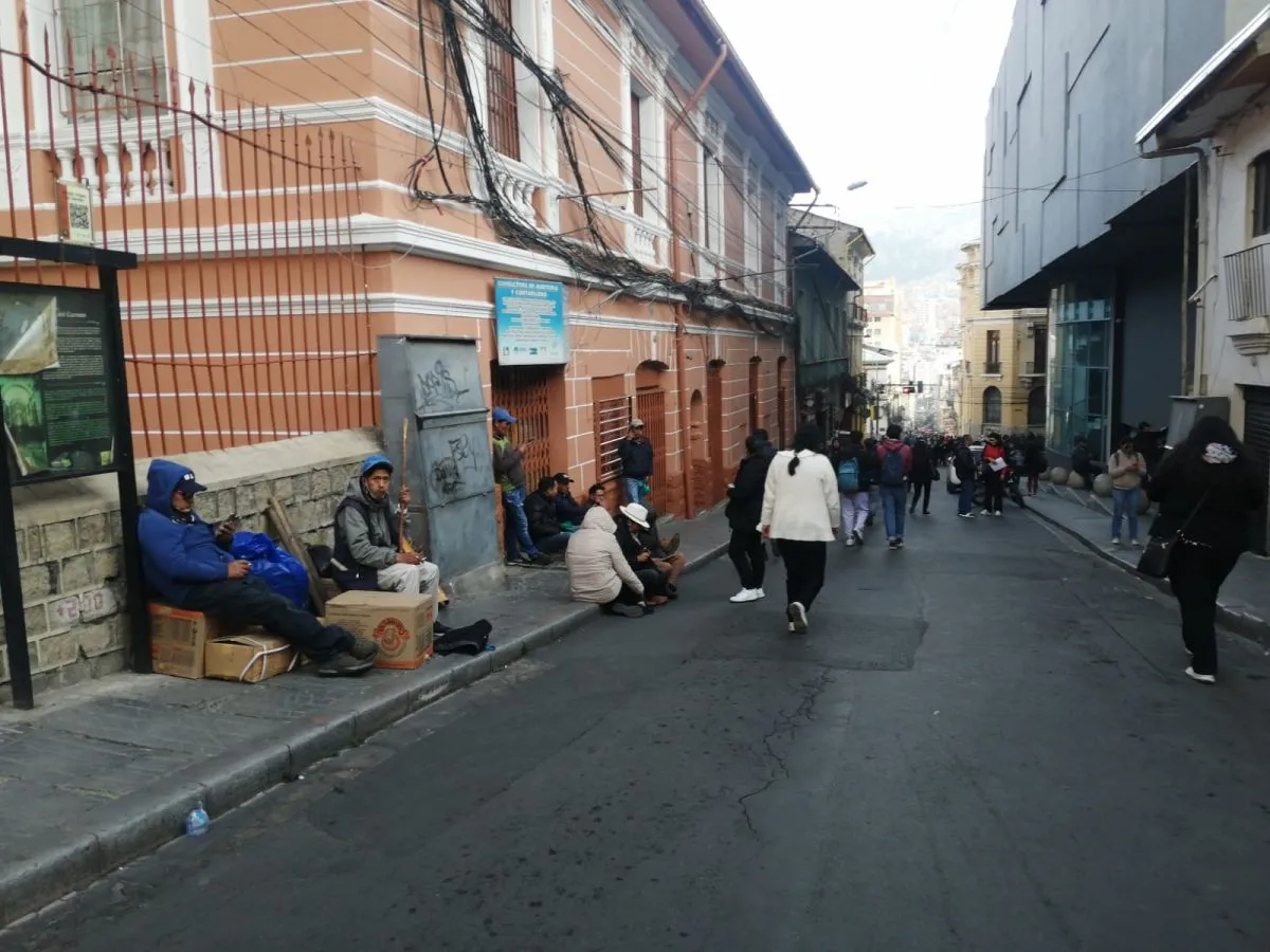 Partidarios, armados con palos, del presidente Luis Arce descansan en la calle Ayacucho. Foto: Leny Chuquimia