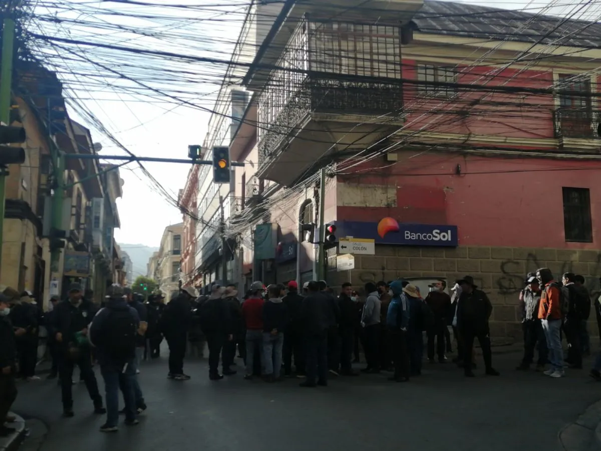 Grupos de choque arcistas resguardan el ingreso a la Plaza Murillo en la calle Ayacucho. Foto: Leny Chuquimia