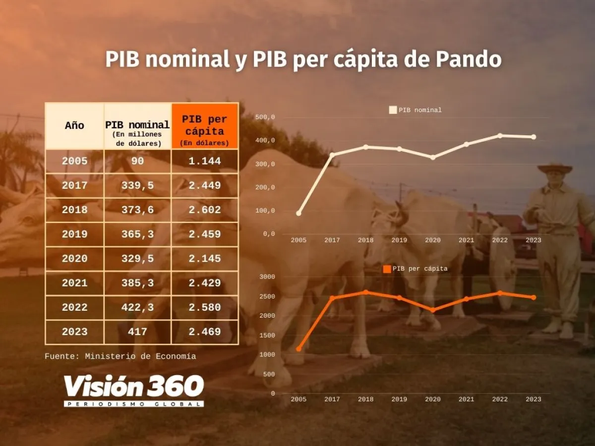 De acuerdo con datos del Ministerio de Economía, el Producto Interno Bruto (PIB) nominal pandino aumentó de 330 millones de dólares en 2020 a 417 millones de dólares en 2023. Este crecimiento refleja el fortalecimiento de la economía y la productividad departamental en los últimos años . Asimismo, el PIB per cápita pasó de 2.145 dólares en 2020 a 2.469 dólares en 2023, lo que muestra una mejora en el nivel de vida de sus habitantes.
