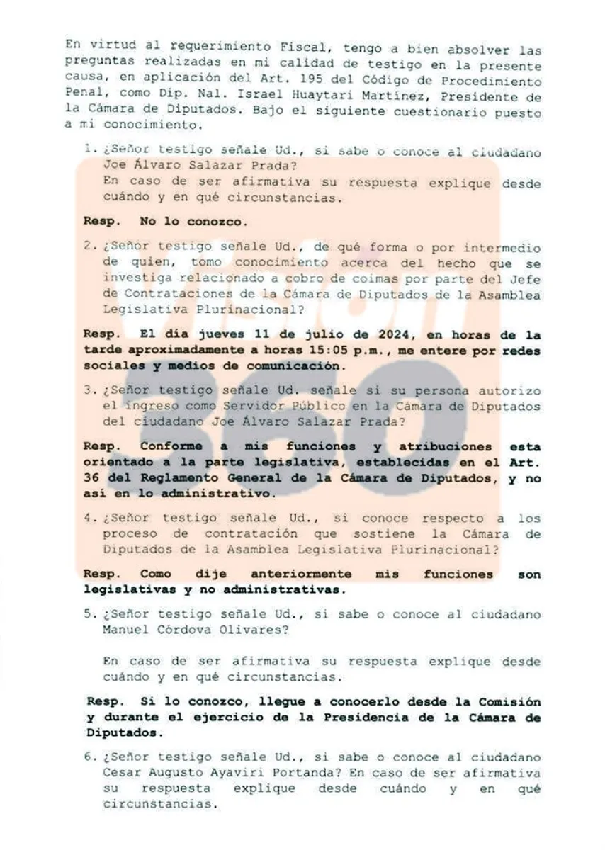 “No lo conozco”, fue la escueta respuesta que Huaytari dio a la pregunta que el fiscal del caso, Franklin Alborta, hizo de forma escrita al presidente de la Cámara de Diputados, involucrado en el caso.