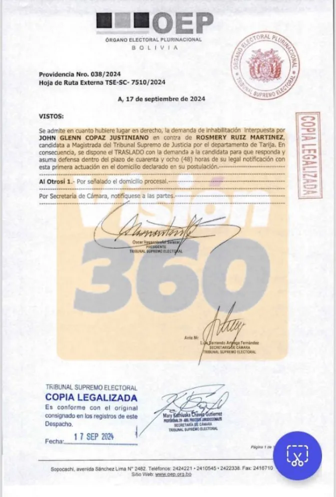 Según los documentos a los que Visión 360 tuvo acceso, el pedido de inhabilitación fue presentado el 16 de septiembre, por el abogado de Santa Cruz, John Copaz. Asimismo, se conoce que la impugnación fue admitida por el Tribunal Supremo Electoral (TSE), instruyendo que se notifique a la interesada.
