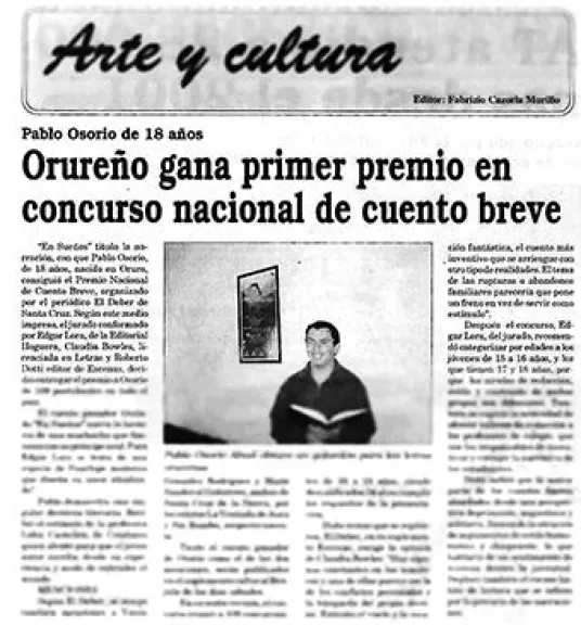 ecorte de periódico en el que se informa del premio que ganó. FOTO: Cortesía Pablo Osorio