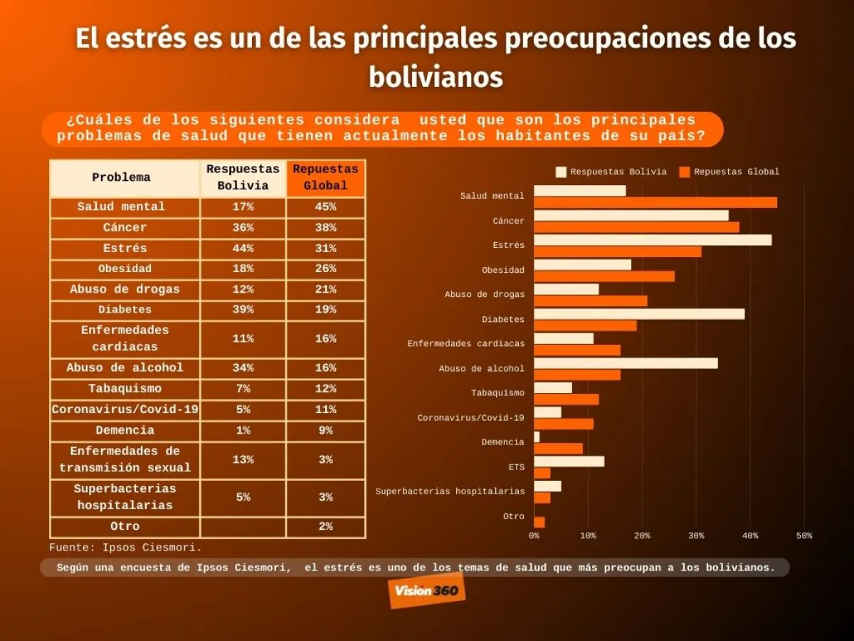 En Bolivia un 44% respondió que el estrés es uno de los principales problemas de salud, en segundo lugar (39%), está la diabetes y le sigue el cáncer (36%) y el abuso del alcohol (34%).