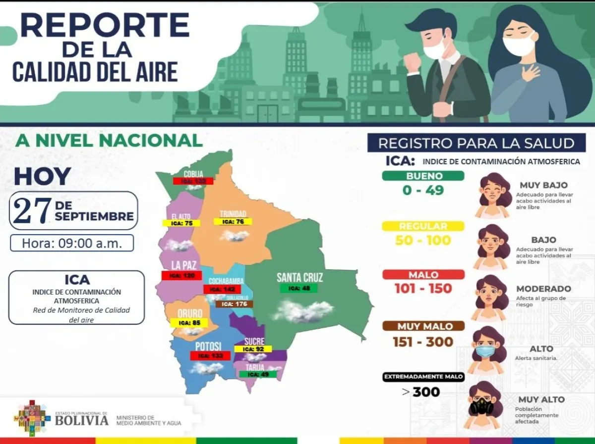 Un reporte del Viceministerio de Medio Ambiente emitido este viernes señala que el municipio de Quillacollo de Cochabamba presenta el más alto índice de contaminación atmosférica, con una medición de 176 (muy malo), mientras que Santa Cruz muestra una mejora considerable, con 48, lo que puede calificarse como “buena”.