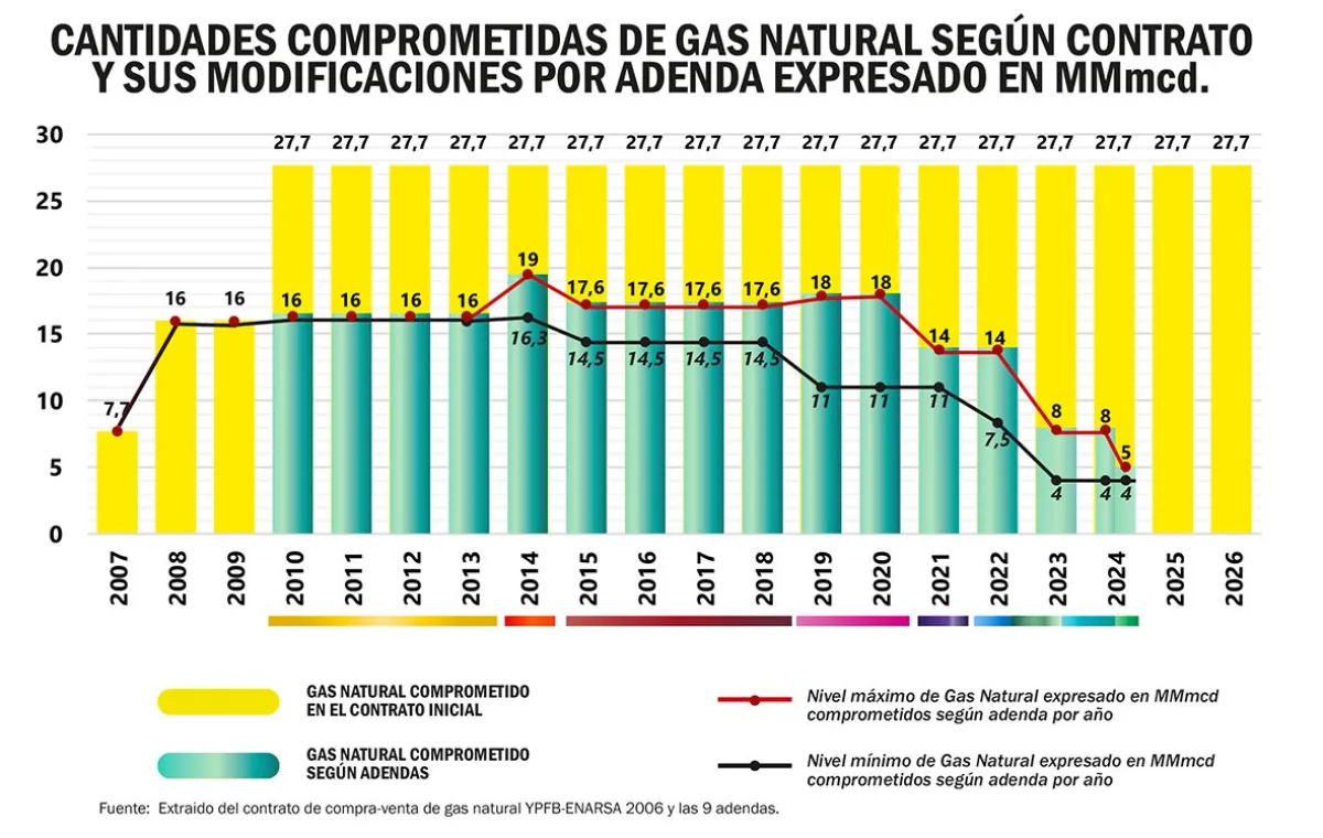 En 17 años, Bolivia suscribió 9 adendas al contrato de venta de gas a la Argentina, debido a que no se pudieron honrar los envíos comprometidos por la caída de la producción. De un volumen máximo de 17 millones de metros cúbicos día (MMmcd) que se exportó en 2017, los envíos cayeron a 5, hasta septiembre, según una investigación del diputado José Luis Porcel de Comunidad Ciudadana (CC).