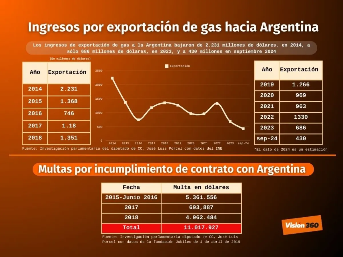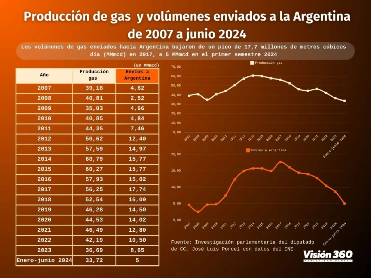 Las cifras expresadas en la investigación del legislador muestran que nunca se pudo cumplir con los volúmenes acordados en el contrato con Argentina y, es más, se tuvieron que negociar adendas donde se modificaron los términos.
