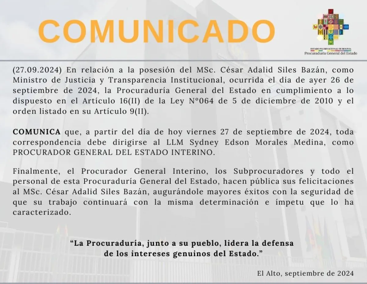 “(La Procuraduría) comunica que a partir del día de hoy viernes 27 de septiembre toda correspondencia debe dirigirse a LLM Sydney Edson Morales Medina, como Procurador General del Estado interino”, señala un comunicado de la entidad estatal.