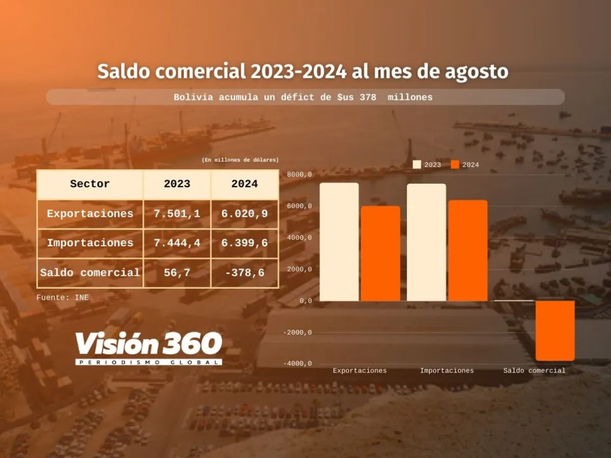 De acuerdo con el INE, en agosto de 2024, el comercio exterior de Bolivia se vio perjudicado por bloqueos de carreteras, fenómenos naturales adversos que afectaron la producción, y por la disminución de precios internacionales de algunos productos tradicionales. Pese a estos factores, se registró un superávit de 51,4 millones de dólares.