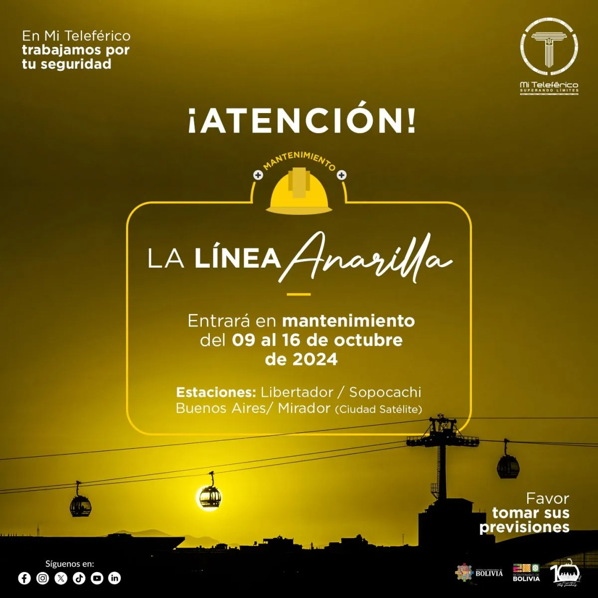 La empresa de transporte por cable Mi Teleférico informó que la línea amarilla entrará en mantenimiento entre el 9 y 16 de octubre, por lo que solicitó a los pasajeros tomar previsiones.