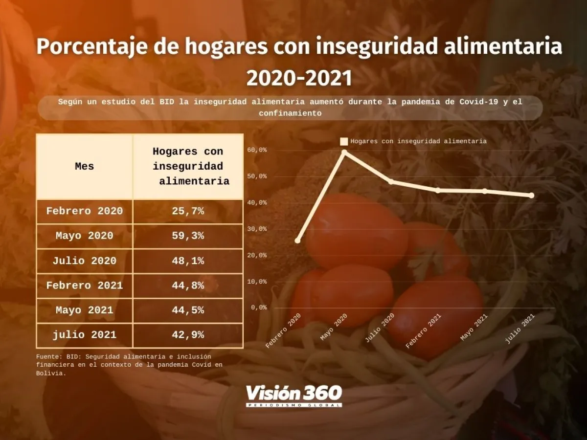 Un estudio e investigación del Banco Interamericano de Desarrollo (BID) revela que la pandemia de Covid-19 y las medidas de confinamiento aplicadas, provocaron que los niveles de inseguridad alimentaria aumenten del 25,7% al 59,3% en los hogares urbanos de Bolivia. Además, el aumento de la inclusión financiera digital amortiguó parte de este problema.