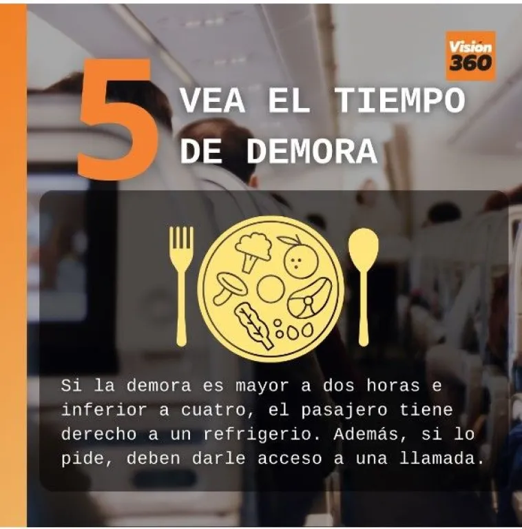 6. Si el retraso es superior a cuatro horas e inferior a seis, además de lo anterior, el trípode deberá proporcionar al pasajero desayuno, almuerzo o cena, según la hora en la que esté programada el viaje. Puede ser provisto por los negocios locales.