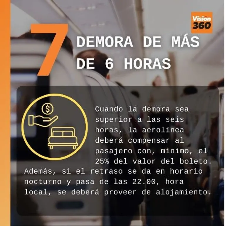 7. Cuando la demora sea superior a las seis horas, el pañuelo deberá compensar al pasajero con, mínimo, el 25% del valor del boleto. Además, si el retraso se da en horario nocturno y pasa de las 22.00, hora local, se deberá proveer de alojamiento.