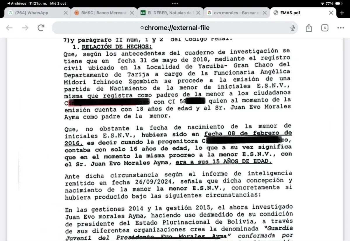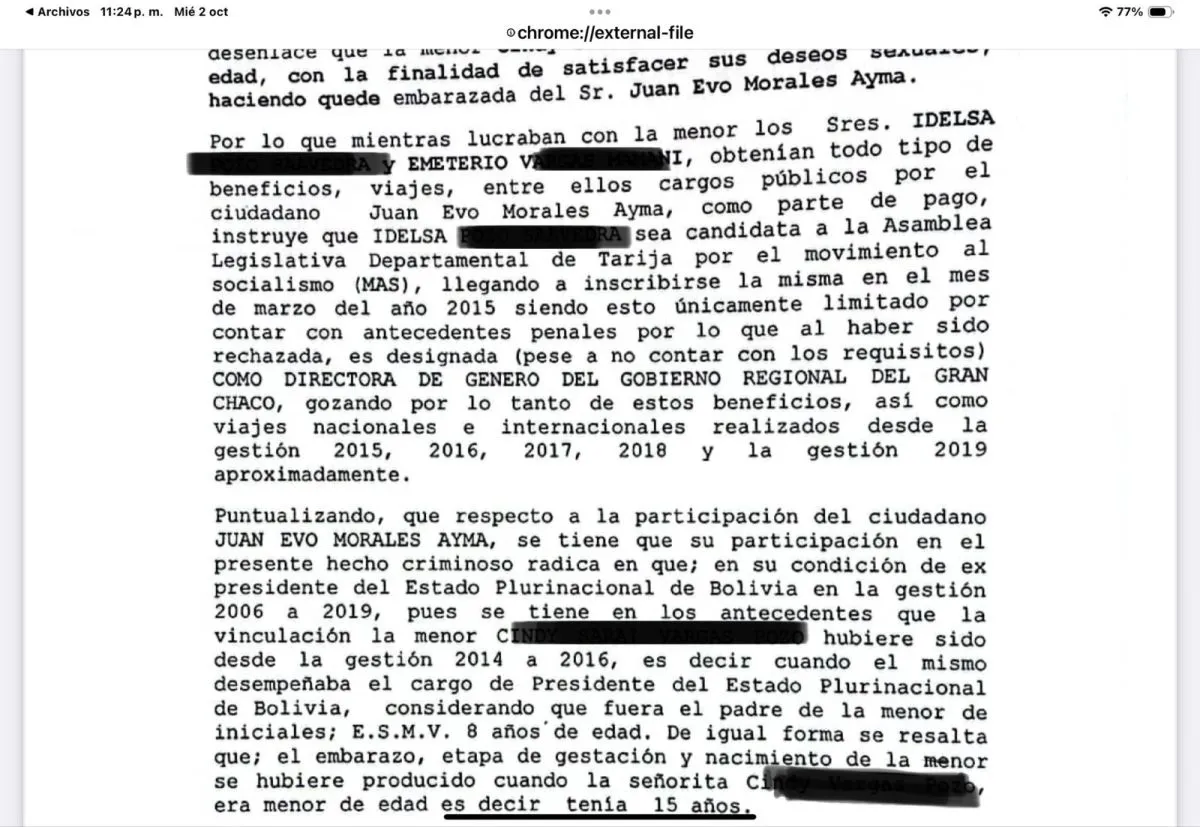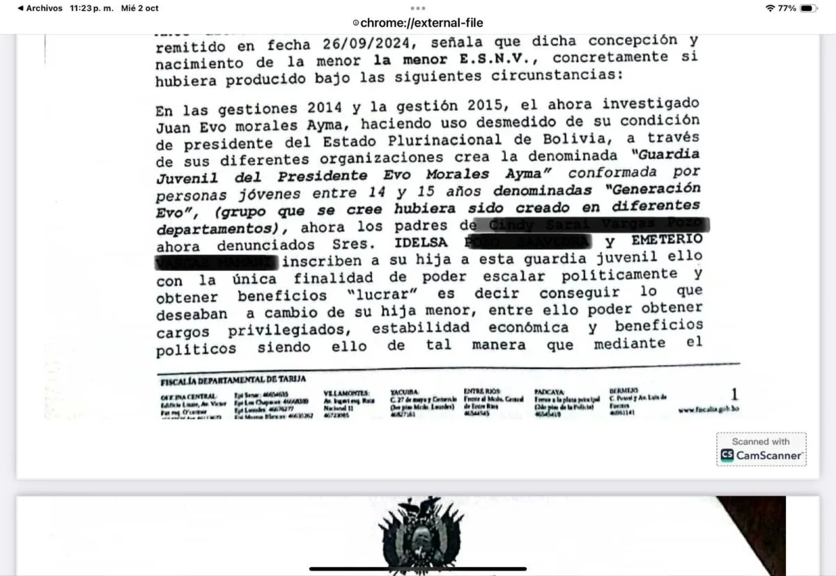 “En las gestiones 2014 y la gestión 2015, el ahora investigado Juan Evo Morales Ayma, haciendo uso desmedido de su condición de su condición de Presidente del Estado Plurinacional de Bolivia, a través de sus diferentes organizaciones crea la denominada “Guardia Juvenil del presidente Evo Morales Ayma” (grupo que se cree hubiera sido creado en diferentes departamentos) ahora los padres de (…) ahora denunciados, señores Idelsa (…) y Demetrio (…) inscriben a su hija a esta guardia juvenil, ello con la única finalidad de poder escalar políticamente”, se lee en el documento, que este jueves fue difundido por varios medios de comunicación.