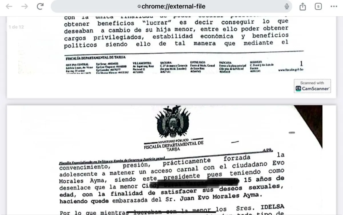 La orden de aprehensión contra el expresidente Evo Morales que fue anulada por la juez de sentencia Nro. 15 del distrito judicial de Santa Cruz, Lilian Moreno Cuéllar, detalla que, de acuerdo a las primeras investigaciones realizadas, el acusado embarazó a una menor de 15 años el año 2015, cuando era presidente de Bolivia.