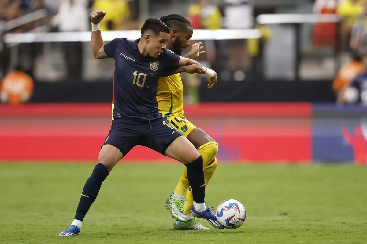 El ecuatoriano Kendry Páez (10) protege la pelota de la marca de un jugador de Jamaica en la Copa América 2024. Foto: EFE