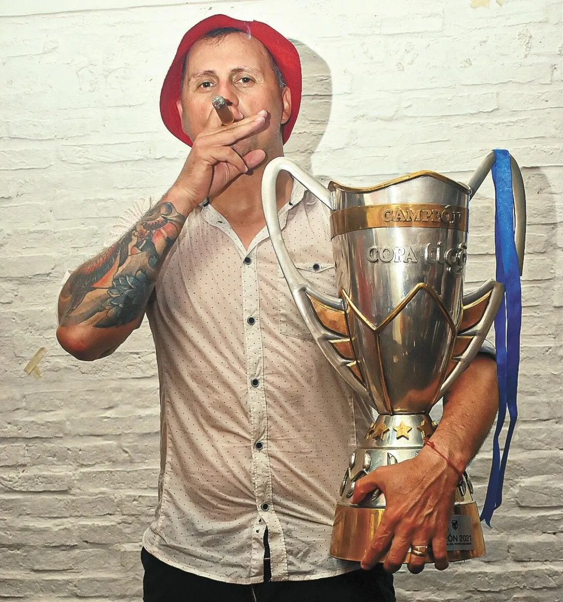 Robledo fuma un puro y agarra la copa que Independiente ganó en 2021. Foto: club Independiente
