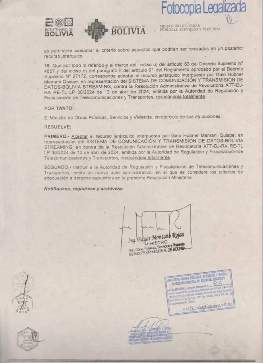 El documento, enviado el 30 de septiembre, denuncia que Ríos se niega a obedecer la Resolución Ministerial No. 178 emitida por el Ministerio de Obras Públicas, el 12 de septiembre de 2024, en la que se revocó la determinación de suspender la licencia de funcionamiento. de FM Bolivia, por errores de procedimiento, contradicciones e incongruencias.