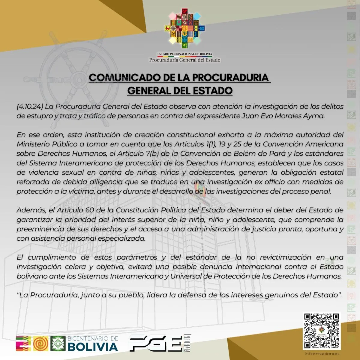 “La Procuraduría observa con atención la investigación de los delitos de estupro y trata y tráfico de personas en contra del expresidente Juan Evo Morales Ayma. En ese orden, esta institución exhorta a la máxima autoridad del Ministerio Público a tomar en cuenta que los Artículos 1(1), 19 y 25 de la Convención Americana sobre Derechos Humanos, el Artículo 7(b) de la Convención de Belém do Pará. . y los estándares del Sistema interamericano de protección de los Derechos Humanos, establecen que los casos de violencia sexual en contra de niñas, niños y adolescentes, generan la obligación estatal reforzada de debida diligencia que se traduce en una investigación de oficio con medidas de protección a la víctima, antes y durante el desarrollo de las investigaciones del proceso penal”, dice esa entidad en un comunicado.