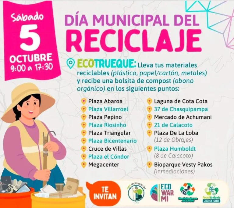 El municipio de La Paz celebra el Día del Reciclaje, este sábado, con un “ecotrueque”, una actividad que se realiza en 16 puntos de la urbe. La gente puede llevar a esos puntos residuos de plástico, papel, cartón y metales y el cambio recibirá una bolsa de humus de compost, producida en el exrelleno sanitario de Mallasa.