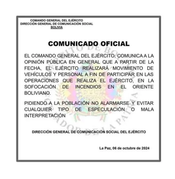 “El Comando General del Ejército, comunica a la opinión pública en general que a partir de la fecha, el ejército realizará movimiento de vehículos y personal a fin de participar en las operaciones que realiza el ejército, en la sofocación de incendios en el oriente boliviano. . . Se pide a la población no alarmarse y evitar cualquier tipo de especulación o mala interpretación”, dice la entidad castrense en un comunicado.