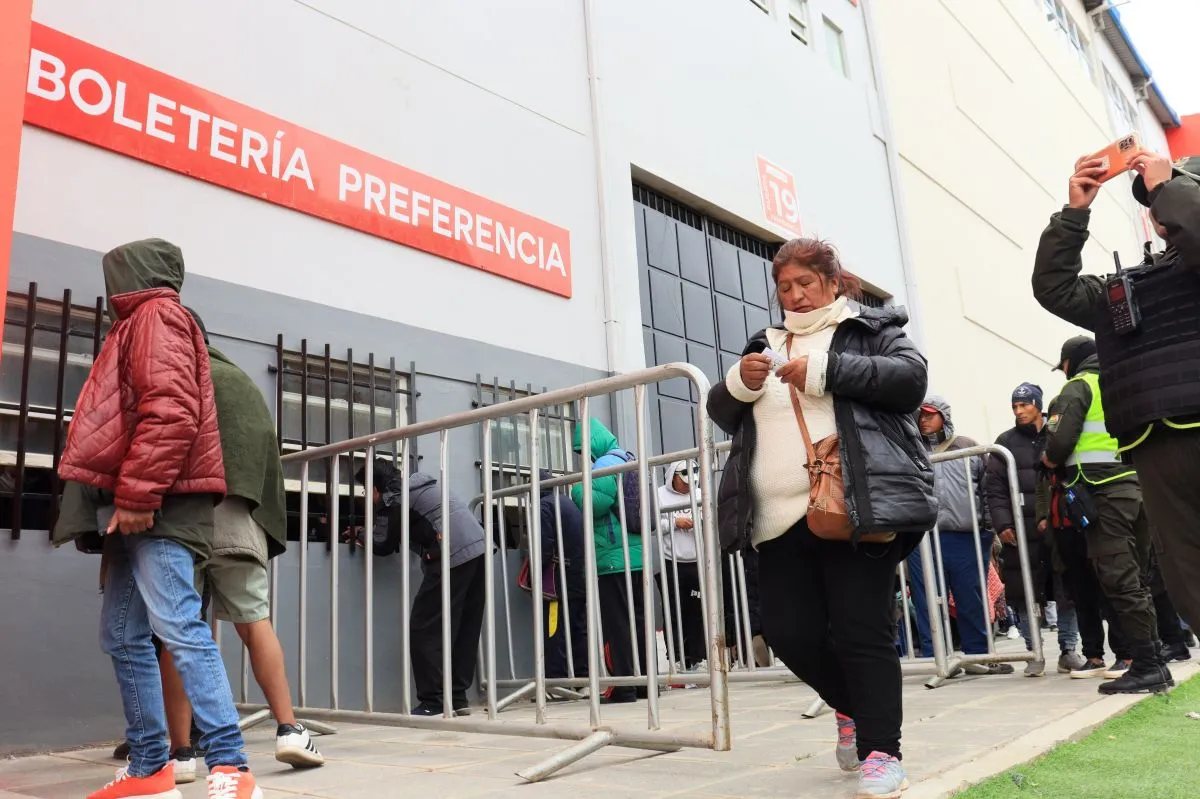 Varias personas hacen filas para la venta de entradas físicas en las boleterías del estadio Municipal de El Alto. Fotos: APG