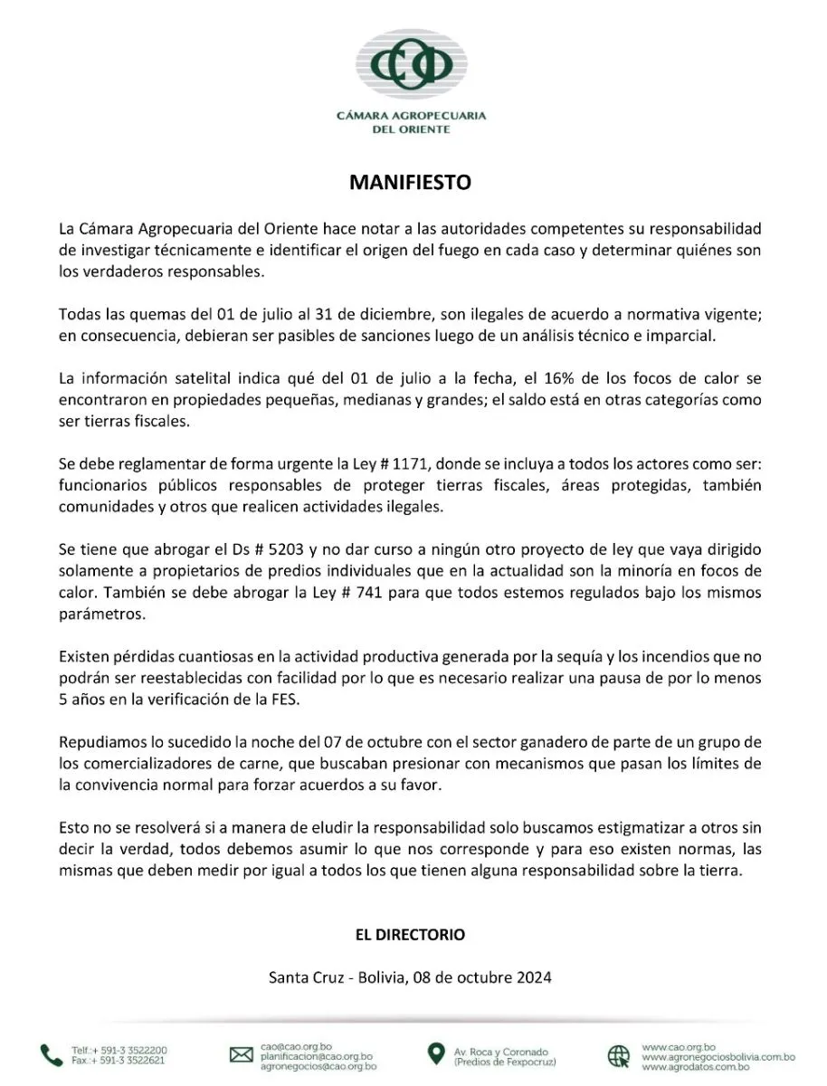 “Todas las quemas del 01 de julio al 31 de diciembre son ilegales de acuerdo con la normativa vigente; en consecuencia, deberán ser pasibles de sanciones luego de un análisis técnico e imparcial”, señala otra parte del comunicado.