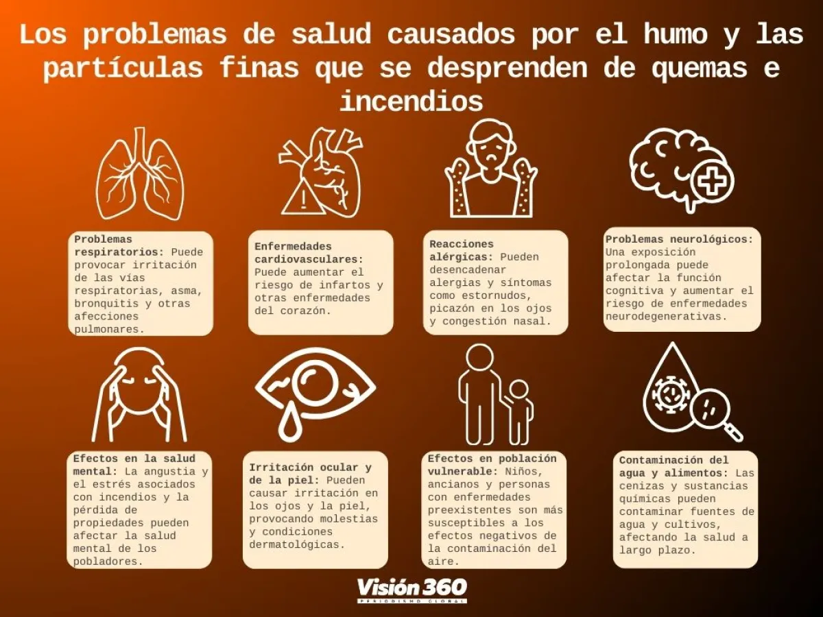 Según la doctora Verduguez las personas expuestas a la humareda en poblaciones y ciudades pueden experimentar diversas secuelas a corto y largo plazo, que pueden afectar su salud física y mental. Algunas de las secuelas más comunes incluyen: