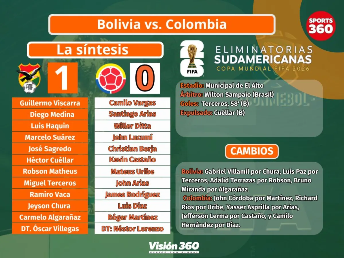 La visita metió presión en el complemento, tuvo más llegadas, pero Bolivia aprovechó con una ágil acción de Miguel Terceros, quien con velocidad y gambeta dejó sin cintura primero a John Lucumí y luego a Kevin Castaño y sacó un zurdazo lejos de la estirada de Vargas. Un golazo a los 58 minutos.