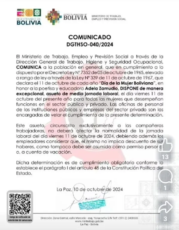 Por el Día de la Mujer Boliviana, el Ministerio de Trabajo dispuso un asueto de media jornada laboral para las mujeres que trabajan en el sector público y privado. Se aclaró que el asueto no puede ser a cuenta de vacaciones o sujeto a descuentos.