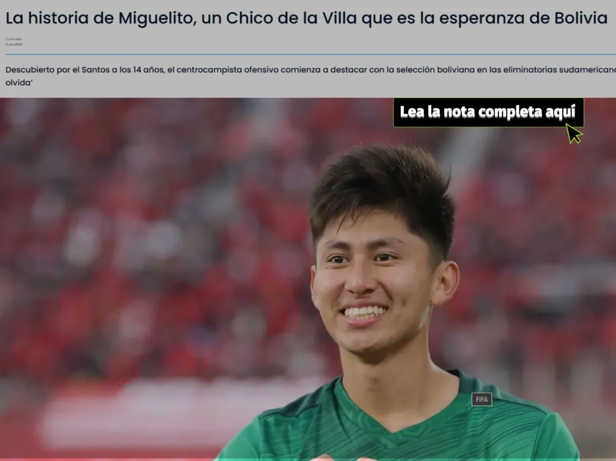 FIFA añade: “considerado un gran talento por el club y la afición, Miguel sigue luchando por ganarse un puesto en el equipo profesional del Santos. Sin embargo, lo que ha logrado en las categorías inferiores del Peixe ha sido suficiente para ser convocado a la selección boliviana”.