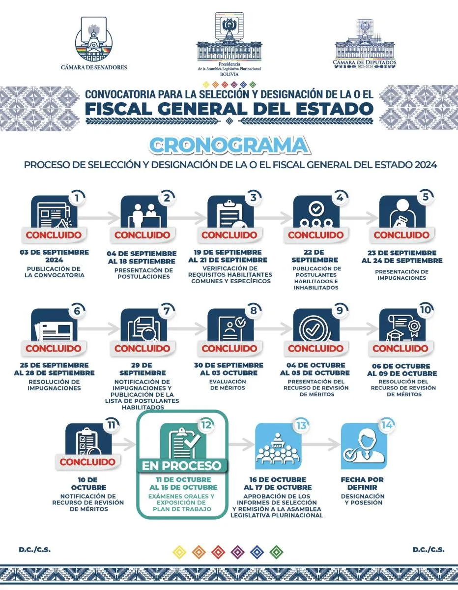 La Comisión Mixta de Justicia Plural recibirá, la tarde de este viernes, el banco de preguntas para los 41 postulantes habilitados a Fiscal General del Estado, las mismas serán entregadas en sobres cerrados en presencia de un notario, informó a Visión 360 el senador de Comunidad Ciudadana (CC), Santiago Ticona.