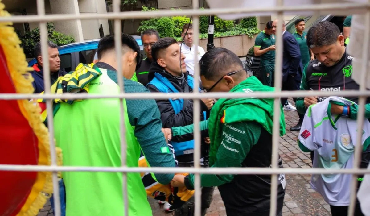 Los jugadores se hicieron esperar unos cuantos minutos, pero cuando aparecieron en las puertas del hotel, hicieron vibrar a los cientos de bolivianos presentes.