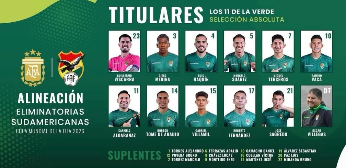 Los legionarios Gabriel Villamil y Roberto Fernández son las dos novedades en la alineación de Bolivia para el partido de este martes (20.00) contra Argentina en el estadio Más Monumental de Buenos Aires, por la décima jornada de la fase de clasificación sudamericana rumbo al Mundial 2026.