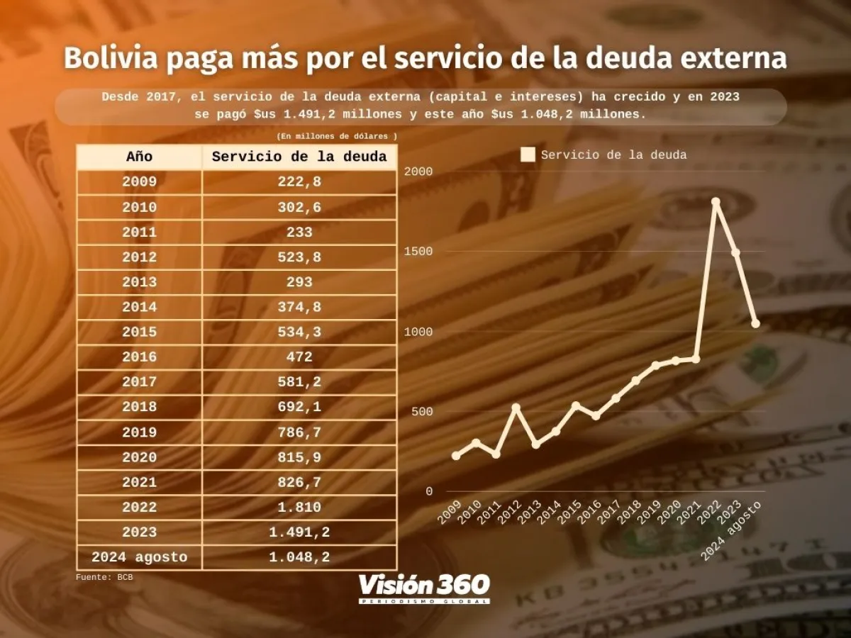 Estas obligaciones  comenzaron a subir con mayor intensidad desde 2018, cuando el Estado tuvo que erogar 692,1 millones de dólares, al año siguiente 786,7 millones de dólares, en 2020 otros 815,9 millones de dólares. En 2021, el servicio representó 826,7 millones de dólares, al año se disparó a 1,810 millones de dólares y en 2023 a 1.492,2 millones de dólares, según revelan las estadísticas del BCB.