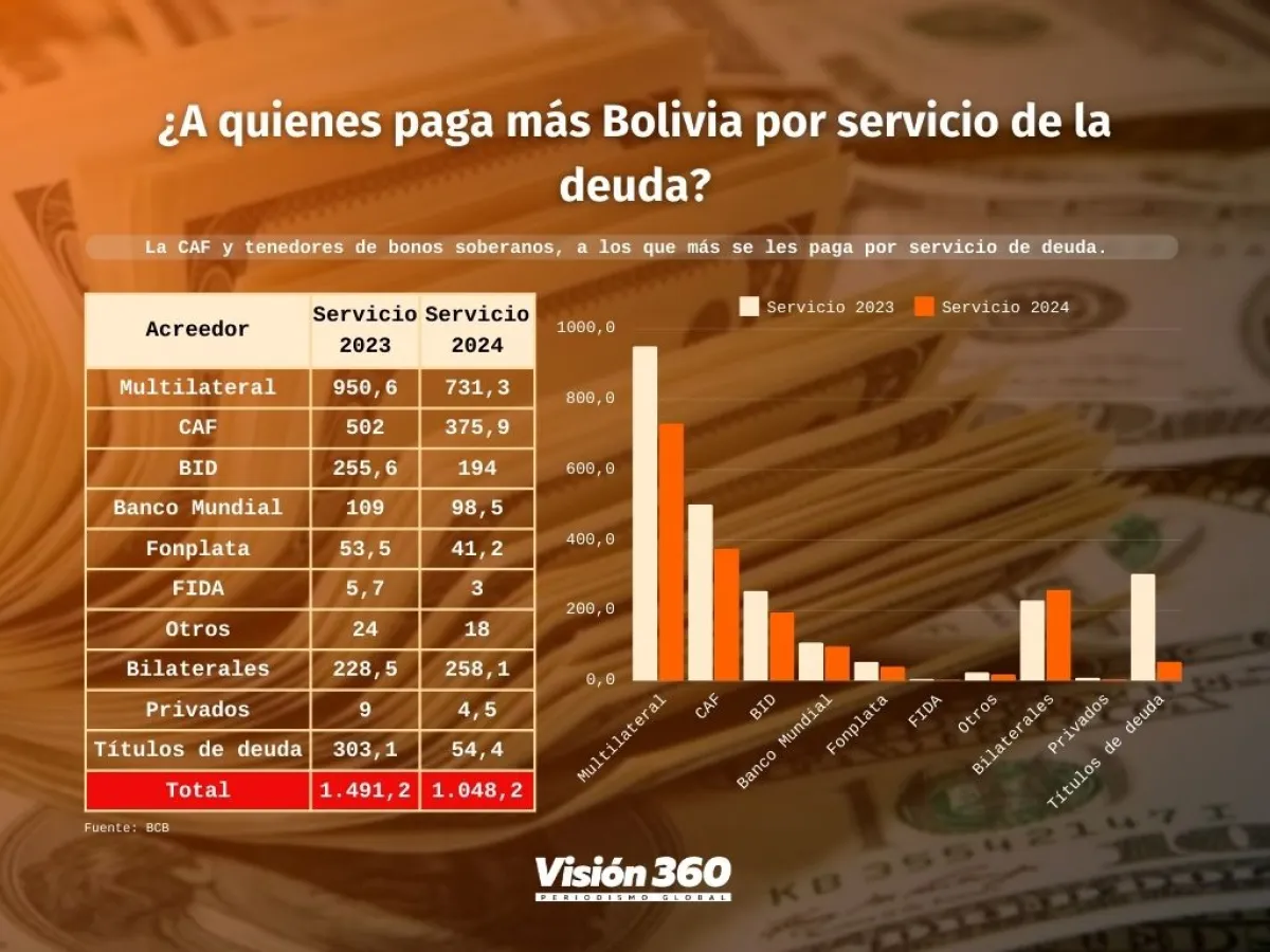 Entre los organismos multilaterales que le prestan a Bolivia está también el Banco Interamericano de Desarrollo (BID), al que 2023 se le pagó 255,6 millones de dólares y este año 194 millones de dólares. El servicio de deuda con el Banco Mundial en 2023 fue de 109 millones de dólares y este año 98,5 millones de dólares; con Fonplata, 53,5 y 41, 2 millones de dólares, respectivamente; y con el FIDa 5,7 y 3 millones de dólares en 2023 y 2024.