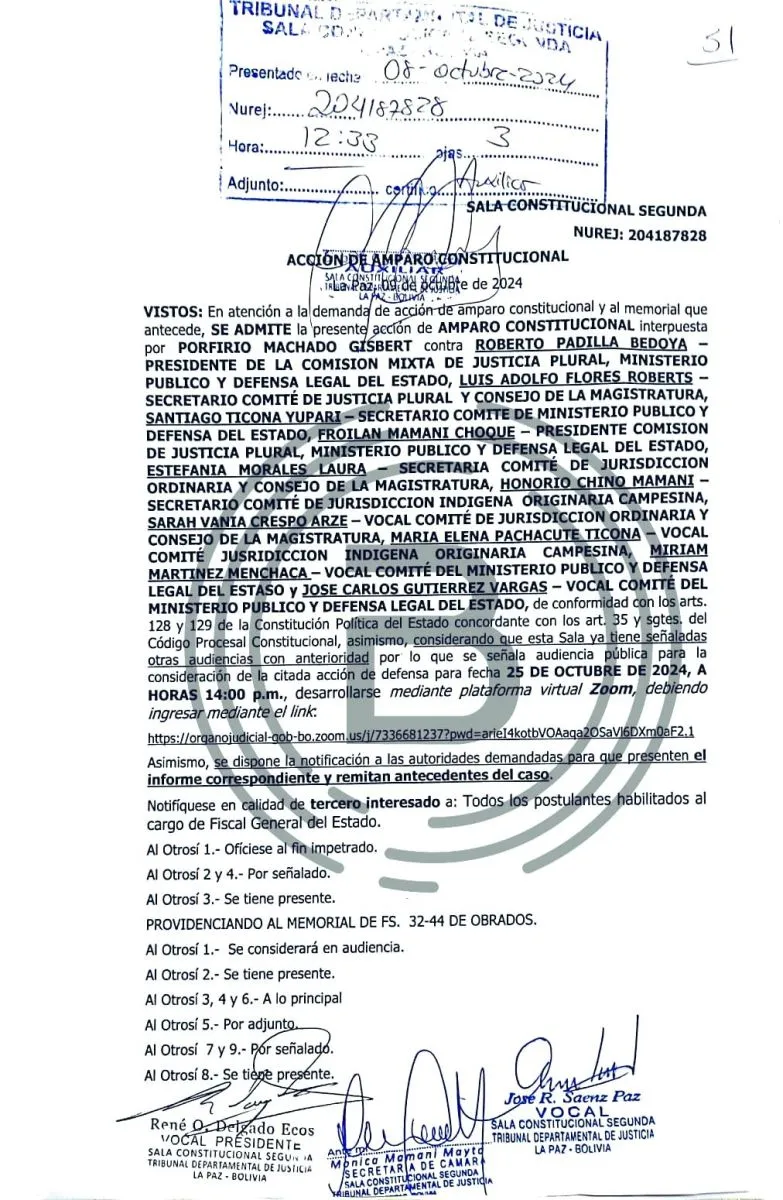 La Sala Constitucional Segunda del Tribunal Departamental de Justicia de La Paz admitió un amparo constitucional que interpuso un candidato a Fiscal General del Estado, lo que podría derivar en la paralización del proceso de selección, que ya se encuentra en la etapa final en la Asamblea Legislativa.