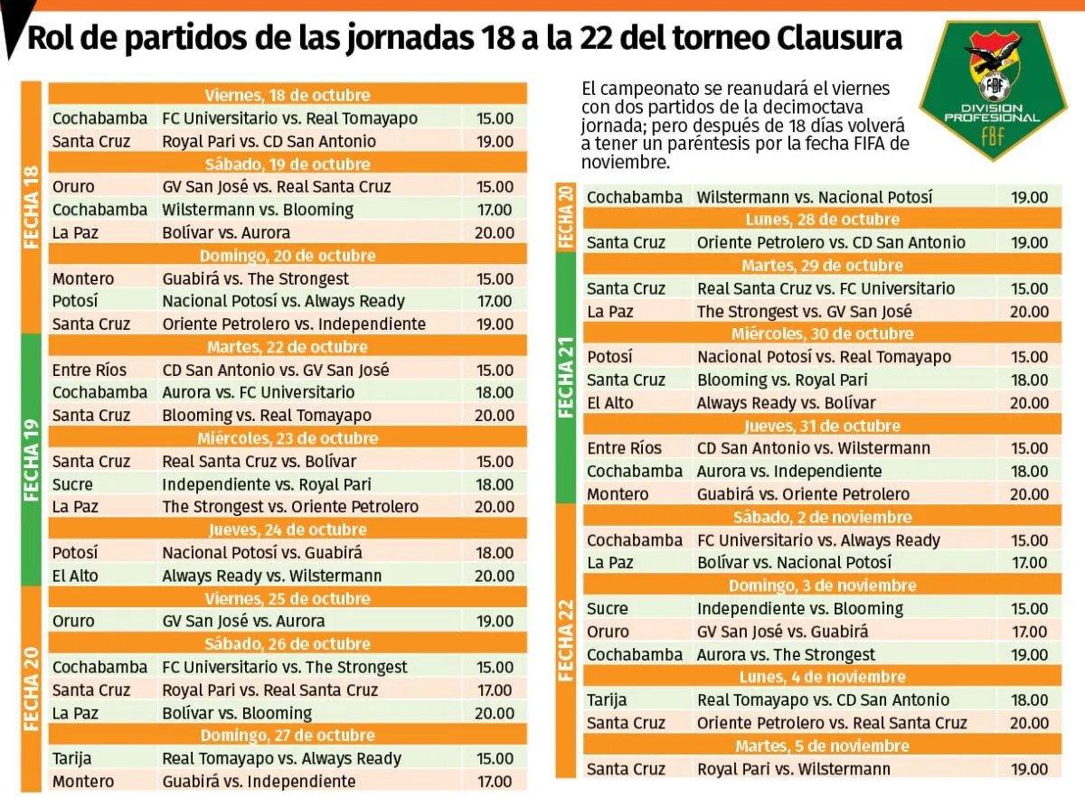 Cuando el campeonato se reanude el próximo viernes —18 de octubre— empezará una maratón de partidos, pues está previsto que hasta el martes 5 de noviembre, fecha en la que el campeonato ingrese en una nueva pausa por la fecha FIFA del siguiente mes, se jueguen cinco jornadas —de la 18 a la 22— en solamente 18 días.