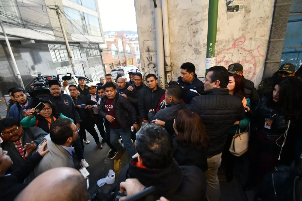 Mientras tanto, en las afueras del juzgado, un grupo de interculturales afines al presidente Luis Arce cruzó insultos, empujones y gritos con un grupo de parlamentarios de Creemos y de Comunidad Ciudadana. “Fue golpe”, gritaban unos, mientras que los otros respondían, “¡fue fraude, violadores!”.