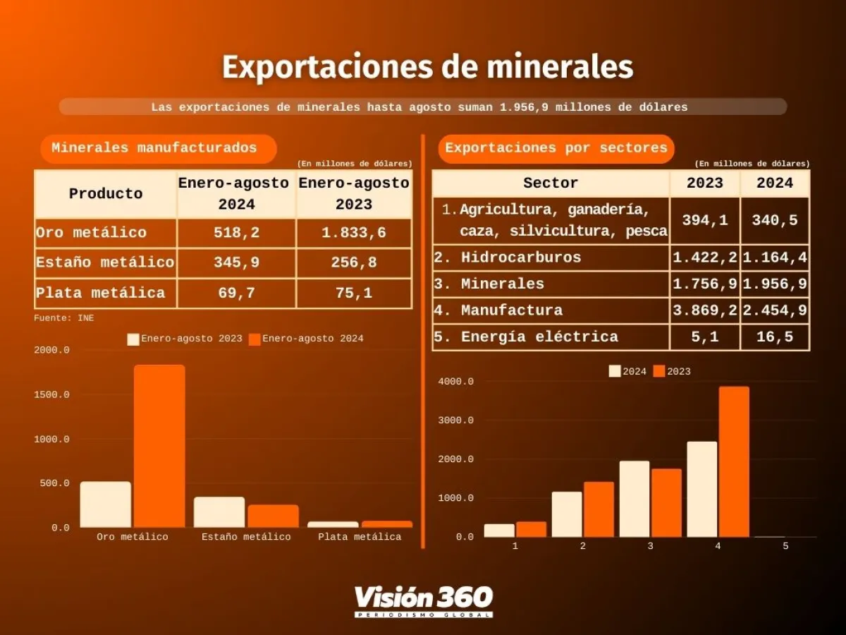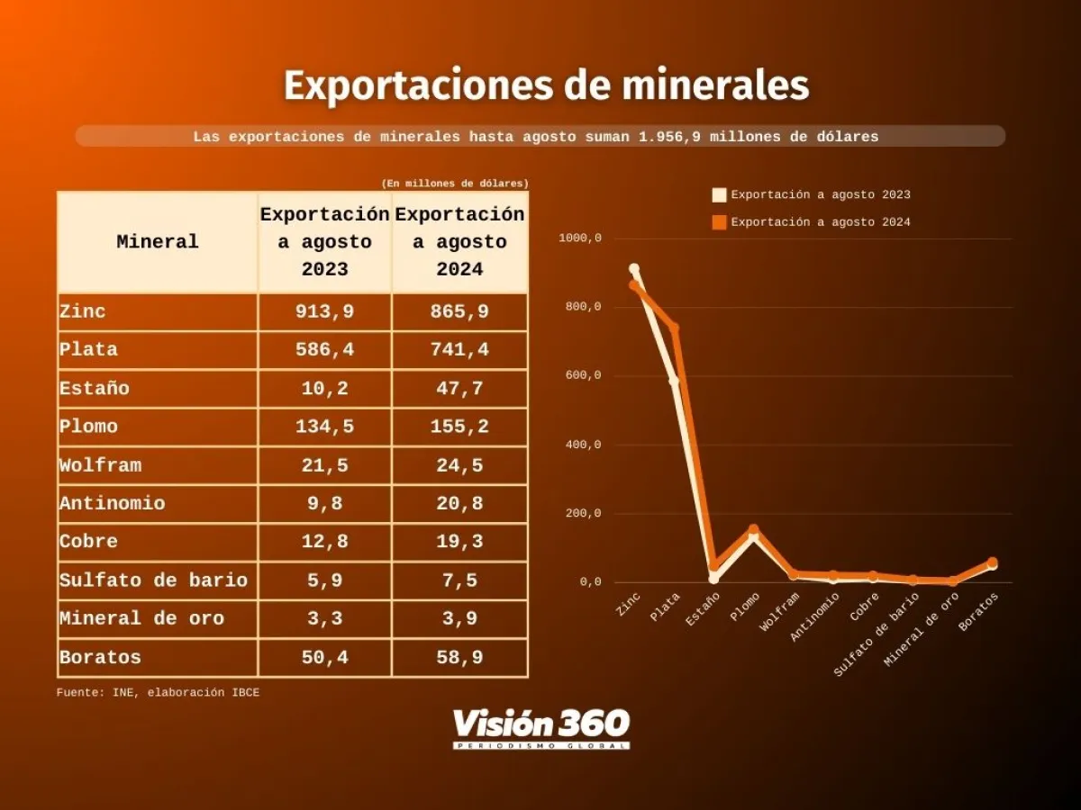 Los datos del INE revelan que todos los minerales aumentaron ventas: plata 741,4 millones de dólares; plomo, 155,2 millones; boratos, 58,9; estaño, 47,7; wólfram, 24,5; antimonio, 20,8; cobre, 19,3; sulfato de bario, 7,5, y mineral de oro, 3,9 millones de dólares.