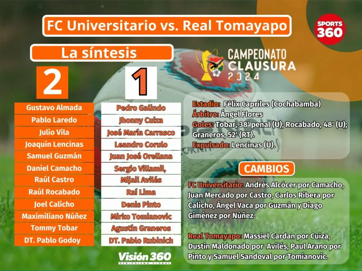 Universitario de Vinto acabó con una racha de ocho partidos sin victorias tras ganarle a Real Tomayapo por 2 a 1, partido de la jornada 18 que se jugó en el estadio Félix Capriles de Cochabamb en la tarde de este viernes, ante escaza cantidad de espectadores.