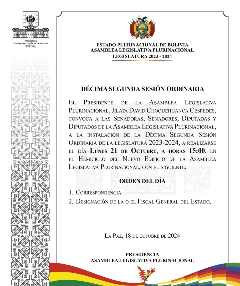 Para las 15.00 del próximo lunes fue convocada la sesión de Asamblea Legislativa Plurinacional (ALP) en la que senadores y diputados elegirán al nuevo Fiscal General del Estado.