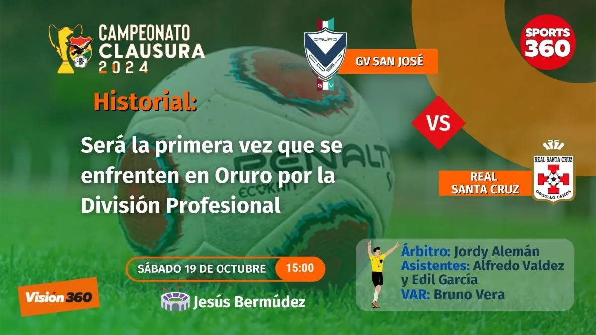 GV San José buscará su quinto triunfo consecutivo en el torneo Clausura cuando reciba en la tarde de este sábado (15.00) a Real Santa Cruz, partido de la jornada 18 que se jugará en el estadio Jesús Bermúdez de Oruro.