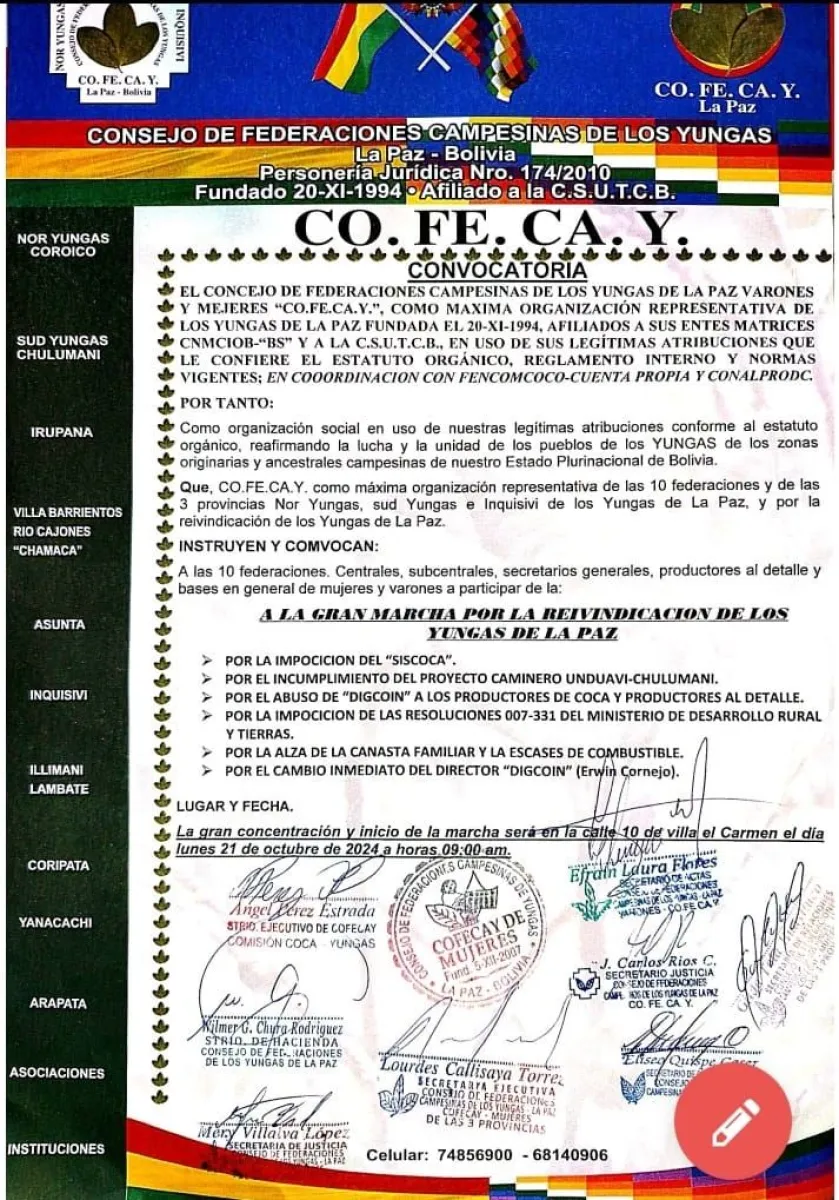 El Consejo de Federaciones Campesinas de los Yungas (Cofecay), mediante un comunicado, convocó a una movilización para el lunes 21 de octubre a partir de las 9 de la mañana. La concentración será en la calle 10 de Villa El Carmen.