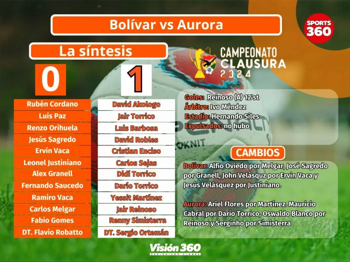 Aurora le dio una lección de efectividad a Bolívar al que le ganó por 1-0 en partido disputado en el estadio Hernando Siles. El equipo académico tuvo las mejores opciones de gol, especialmente en el primer tiempo, pero el Ewquipo del Pueblo atacó menos y concretó el único tanto del juego por intermedio de Jair Reinoso.