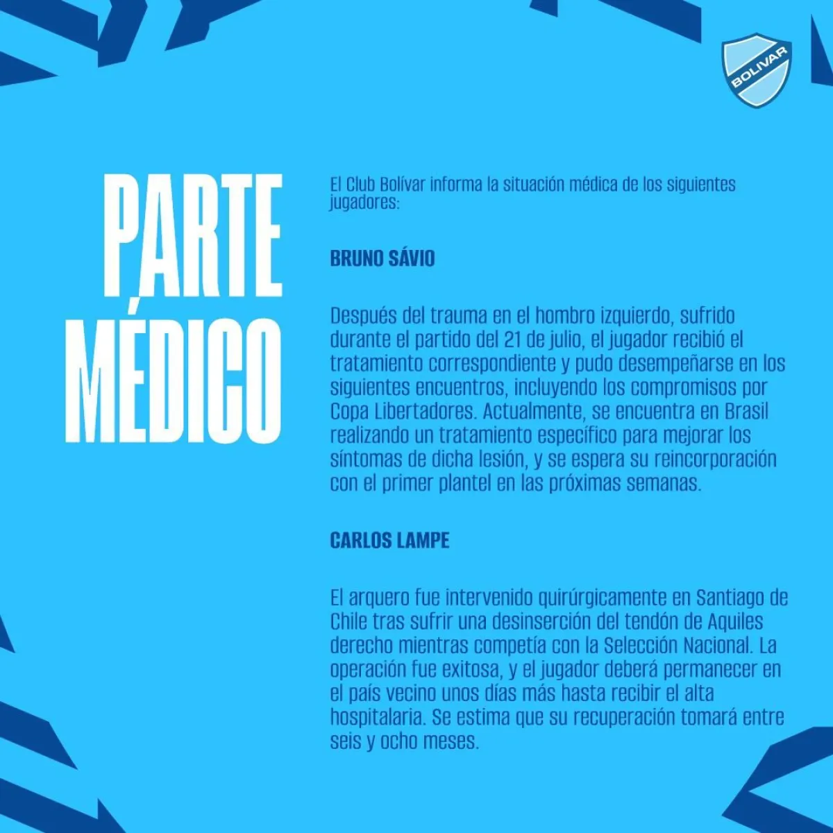 El 13 de septiembre, Bolívar publicó varios partes médicos de sus jugadores lesionados, en el  caso de Sávio citaba lo siguiente: "Después del trauma en el hombro izquierdo, sufrido durante el partido del 21 de julio (frente a Always Ready en La Paz por la sexta jornada del certamen actual), el jugador recibió el tratamiento correspondiente y pudo desempañarse en los siguientes encuentros, incluyendo los compromisos por Copa Libertadores. Actualmente se encuentra en Brasil realizando un tratamiento específico para mejorar los síntomas de dicha lesión, se espera su reincorporación con el primer plantel en las próximas semanas".