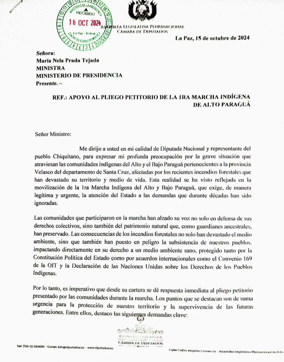La diputada de Creemos, María René Álvarez, reveló ayer que envió tres cartas a los ministros de Medio Ambiente, Alan Lispenguer, de la presidencia, María René Álvarez y a su colega ministro de Desarrollo Rural y Tierras, Juan Flores, con la demanda de atender de forma inmediata el pliego petitorio.