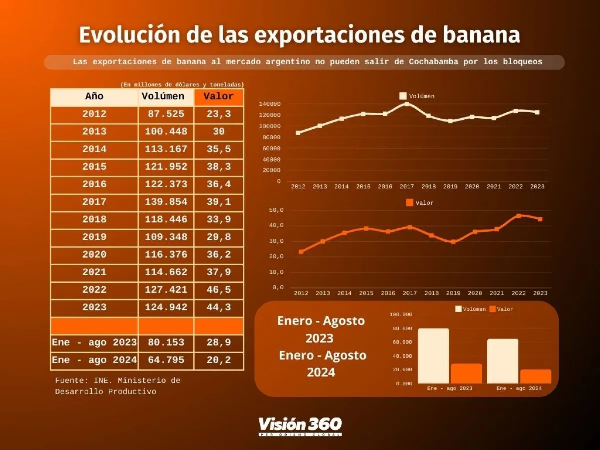 “El bloqueo nos está matando”, dice Andy Choque productor bananero al igual que Miguel Zambrana quien asegura que son mil toneladas de banano que no se ha podido enviar al mercado argentino en los últimos 10 días por la medida de presión iniciada por los sectores afines a Evo Morales.
