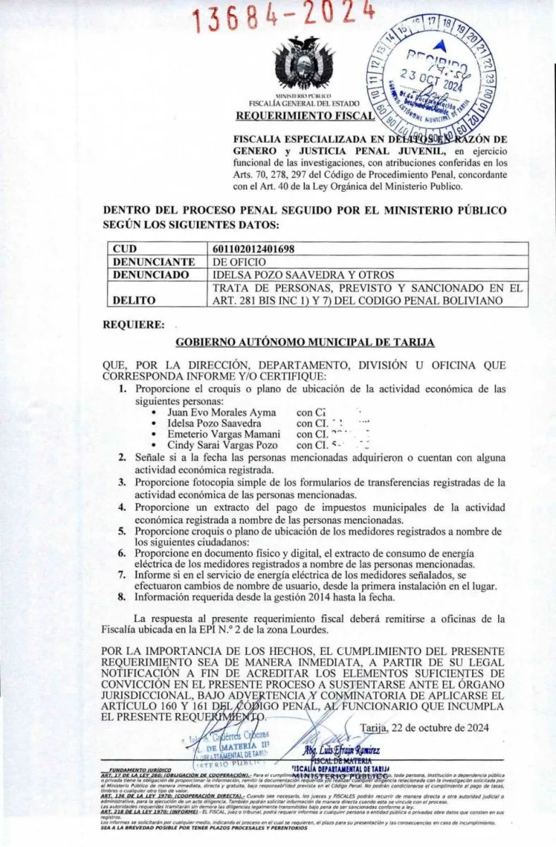 La Fiscalía de Tarija instruyó al Gobierno Municipal de ese departamento que brinde toda la información relacionada a las actividades económicas del expresidente Evo Morales. El requerimiento se emitió en el marco del caso de estupro y trata de personas por el que es investigado el exmandatario.