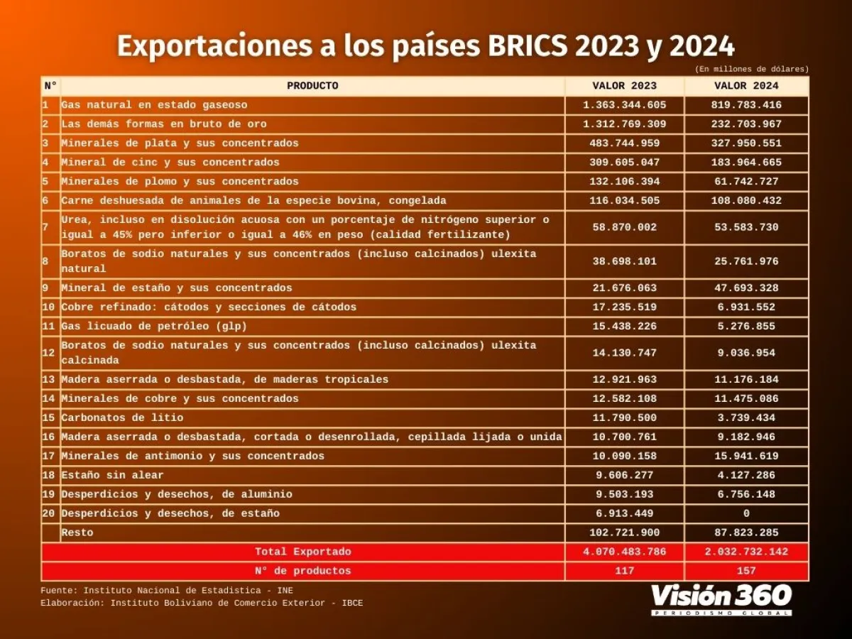 Según datos deI Instituto Nacional de Estadística (INE), procesados por el Instituto Boliviano de Comercio Exterior (IBCE), en 2023 Bolivia vendió a ese grupo 117 productos por un valor de 4.070,4 millones de dólares y este año en los primeros ocho meses 157 productos por valor de 2.032,7 millones de dólares.