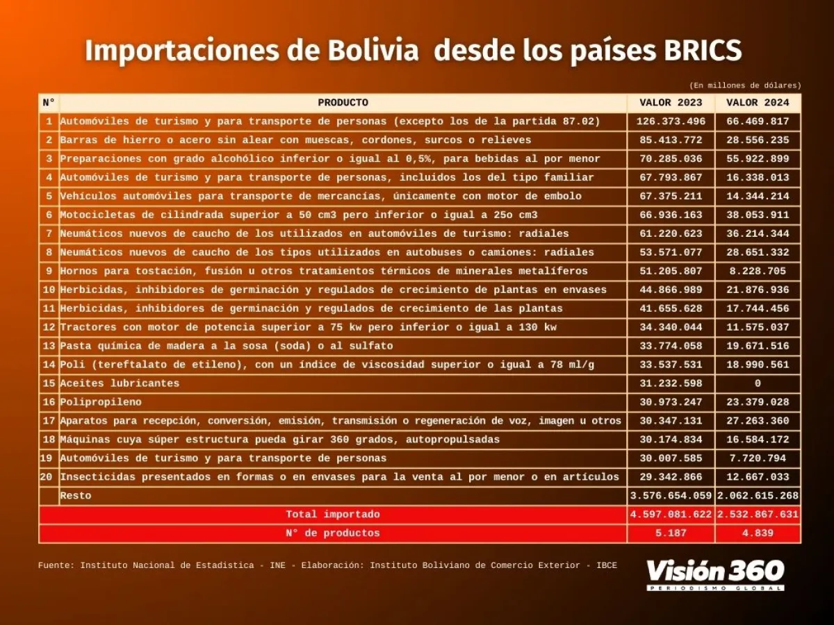 En 2023 Bolivia importó de los Brics 5.187 productos por valor de 4.597 millones de dólares y este año hasta el mes de agosto 4.839 productos por valor de 2.532,8 millones de dólares.